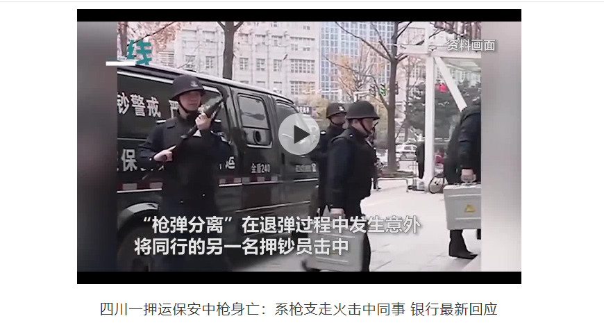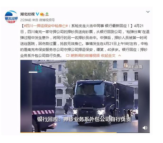 4月21日,四川南充,一家守押公司的押钞员送完钞票,从银行回到公司,“枪弹分离”在退弹过程中发生意外,将同行的另一名押钞员击中。4月23日,记者获悉,中弹后,押钞人员被第一时间送往医院,因伤势过重,抢救无效身亡。守押公司为南充市保安服务总公司守押公司。对此,银行回应表示,押钞业务系外包公司自行负责。