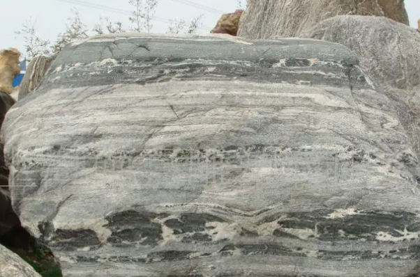 千层石因为表面有着层层叠叠的横向纹理而得名,颜色多为黑、白、灰相间,质地很坚硬,用硬物击打甚至能听到金属的声音,因为它造型奇特,有着独特的观赏价值,是制作假山瀑布的首选。