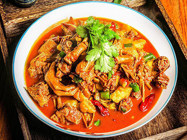 黔江鸡杂是重庆黔江煨锅系列的代表菜,使用的烹饪方法还是土家的传统手法。鸡杂一般是指鸡肠、鸡胗、鸡心、鸡肝等鸡内脏,这些食材本身有很重的腥味,如果没有特殊的烹饪技术烧出来的鸡杂难以入口。黔江鸡杂是在鸡杂里加入了土豆和泡椒,使得鸡杂本身的腥味大减,吃起来香辣脆爽,开胃下饭。