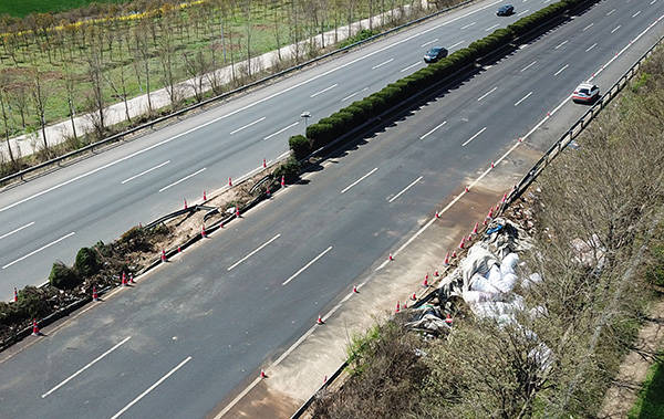 4月4日,事故现场路面已清理完毕,恢复通行。但隔离栏外仍有大量遗撒的货物等待清理(无人机照片)。新华社 图