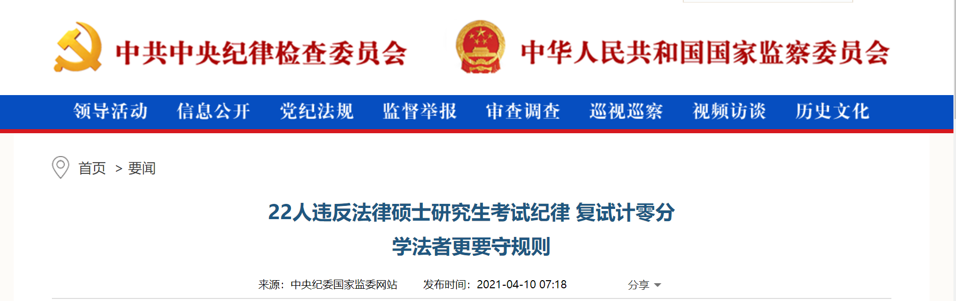 今日,据中纪委网站,研究生入学考试初试获得高分成绩,复试成绩却为零分,问题出在哪里?日前,中国人民大学法律(非法学)硕士专业学位部分考生“复试专业课和综合素质面试”成绩为“零分”一度引发热议。4月9日晚间,中国人民大学法学院在官网发布声明,对备受关注的热点事件作出回应。