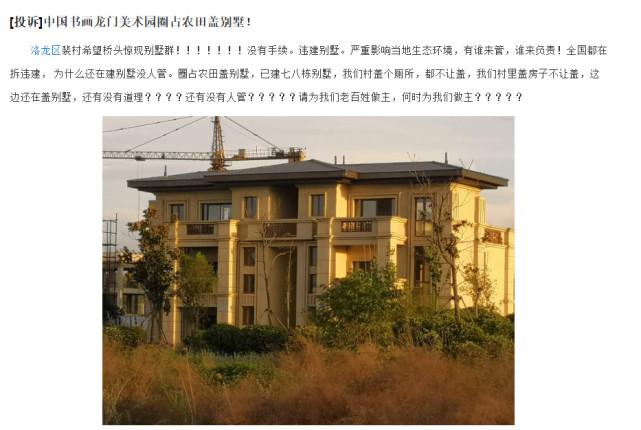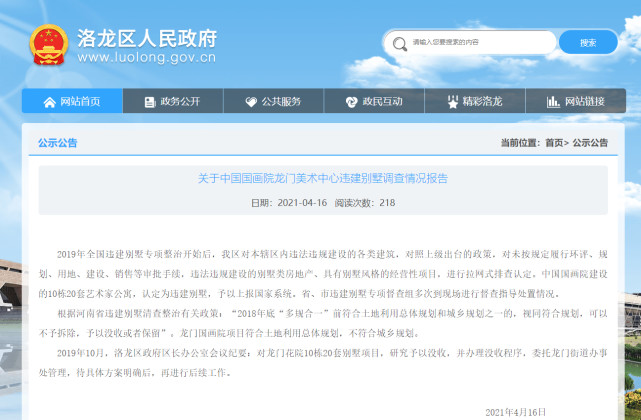 4月16日,河南省洛阳市洛龙区政府网站政务公开栏发布了一则《关于中国国画院龙门美术中心违建别墅调查情况报告》。