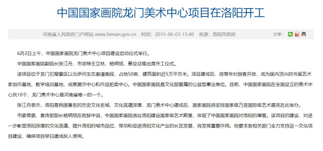 至今,仍能在河南省人民政府网站上查到中国国家画院龙门美术中心项目2015年6月2日在洛阳开工的消息。时任中国国家画院副院长张江舟,洛阳市领导王立林、杨炳旭、翟应征等出席开工仪式。当时的报道称,中国国家画院在全国设立的美术中心共10个,龙门美术中心是河南省唯一的一个。