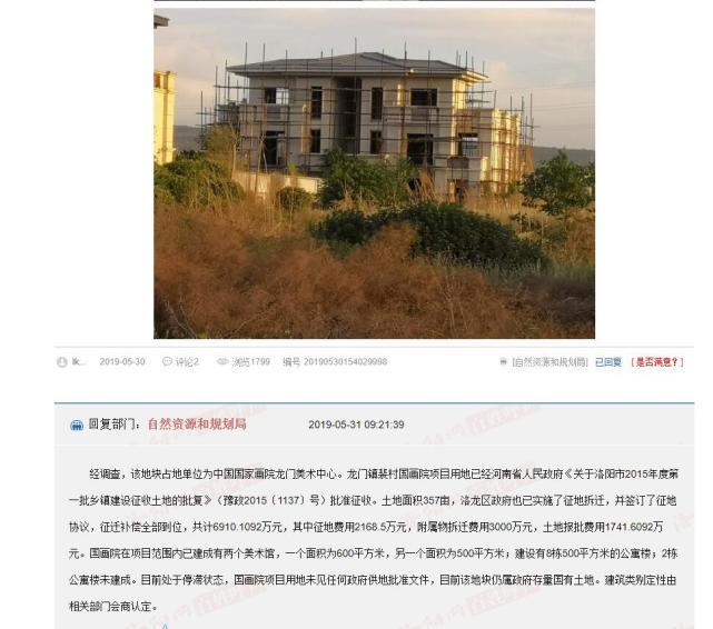此外,洛阳网上还有一条2019年5月的投诉信息,从当地主管部门的回复中提及该项目用地未见任何政府供地批准文件。网友投诉这家美术中心圈占农田盖别墅,影响当地生态环境。洛阳市自然资源和规划局回复称,经调查,该地块占地单位为中国国家画院龙门美术中心。龙门镇裴村国画院项目用地已经河南省人民政府2015年批准征收。土地面积357亩,洛龙区政府也已实施了征地拆迁,并签订征地协议,征迁补偿全部到位。国画院在项目范围内建成有两个美术馆,建设有8栋500平方米的公寓楼;2栋公寓楼未建成。目前处于停滞状态,国画院项目用地未见任何政府供地批准文件,该地块仍属政府存量国有土地。建筑类别定性由相关部门会商认定。