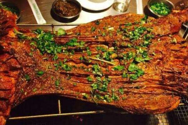 新疆烤全羊这个在国内外享有盛誉的新疆代表名菜,是在新疆维吾尔族餐饮体系中占有重要地位的菜肴,在烤制时会利用新疆本地上好的羯羊配合上调好的糊状汁制经过蜜蜂焖烤一小时制成,具有肉质细腻、鲜嫩无比特点的新疆招待贵宾和重要客人的菜肴。