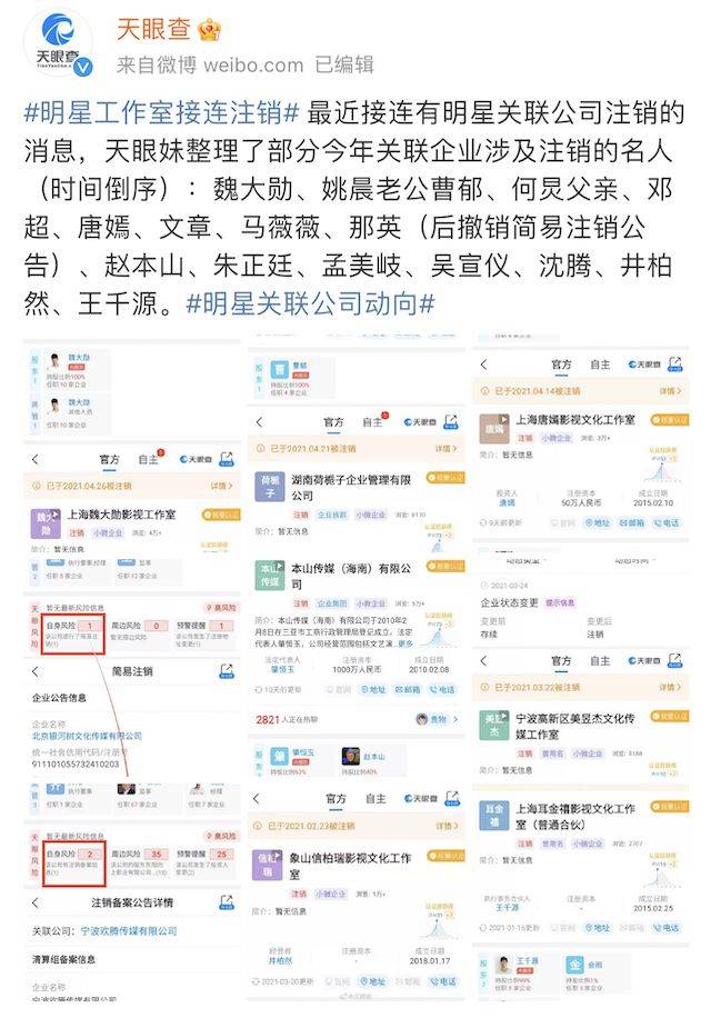 就在相关部门表示要严查之际,近期,多个明星工作室被注销。