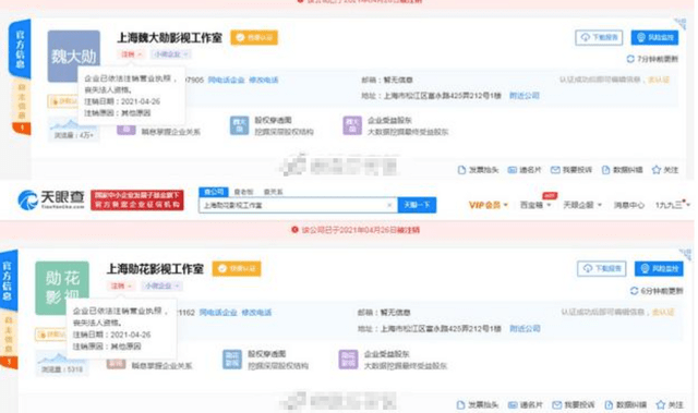 这两家工作室都成立有一段时间了,一家成立于2016年,一家成立于2018年,同时注销实在很难不让人起疑心,再加上魏大勋几天前还从一家房地产公司撤股,让网友们的好奇心更加重了。