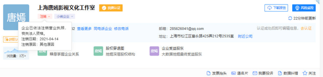 4月14日,唐嫣和文章的工作室都变成了注销状态。