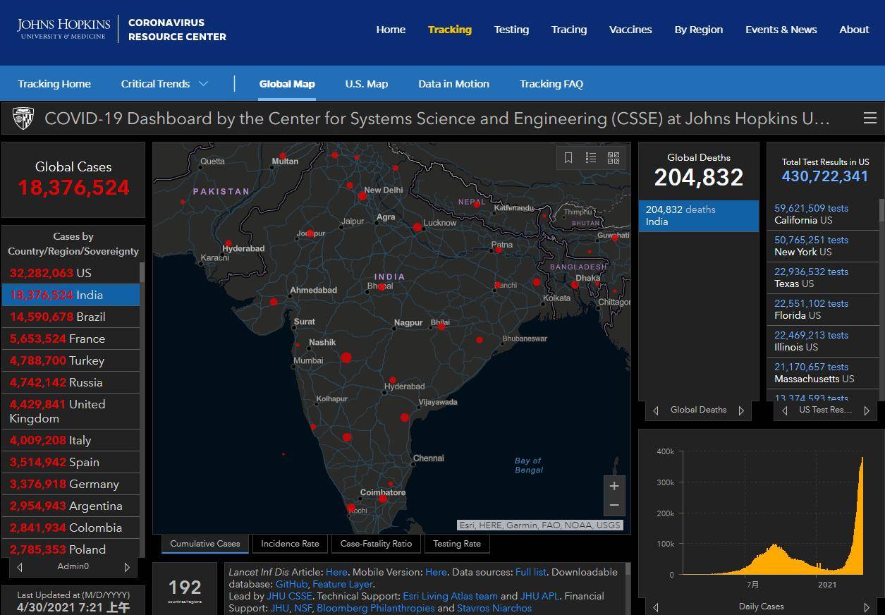 昨日,印度日新增病例突破379000例,再创新高。根据美国约翰斯·霍普金斯大学统计数据,截至北京时间2021年4月30日7时21分,印度新冠肺炎累计确诊病例18376524例,累计死亡病例204832例。