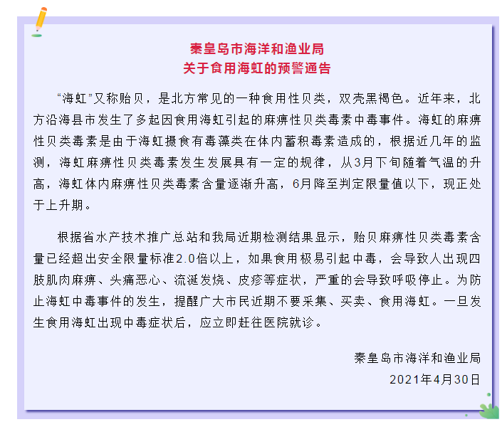 4月30日,秦皇岛市海洋和渔业局发布预警:“海虹”又称贻贝,是北方常见的一种食用性贝类,双壳黑褐色。近年来,北方沿海县市发生了多起因食用海虹引起的麻痹性贝类毒素中毒事件。海虹的麻痹性贝类毒素是由于海虹摄食有毒藻类在体内蓄积毒素造成的,根据近几年的监测,海虹麻痹性贝类毒素发生发展具有一定的规律,从3月下旬随着气温的升高,海虹体内麻痹性贝类毒素含量逐渐升高,6月降至判定限量值以下,现正处于上升期。