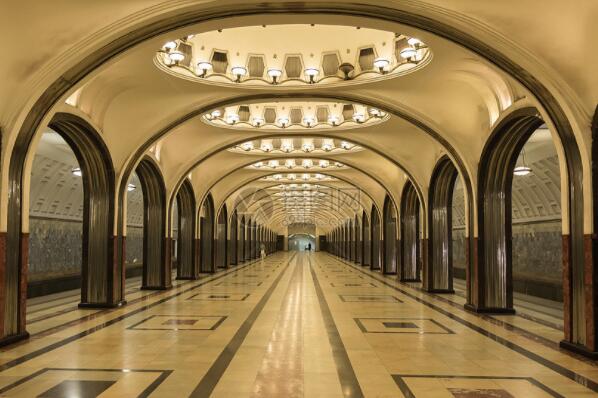 这里与1938年9月正式开放,位于俄罗斯莫斯科深绿线中心的地铁站,内部整体以白色为基调,其中大理石的圆形拱门还被宽大的金属装饰条紧紧围绕,其中每个穹顶上还装饰有彩色的马赛克笔画,开放的同年还获得了纽约国际展览会的设计大奖。
