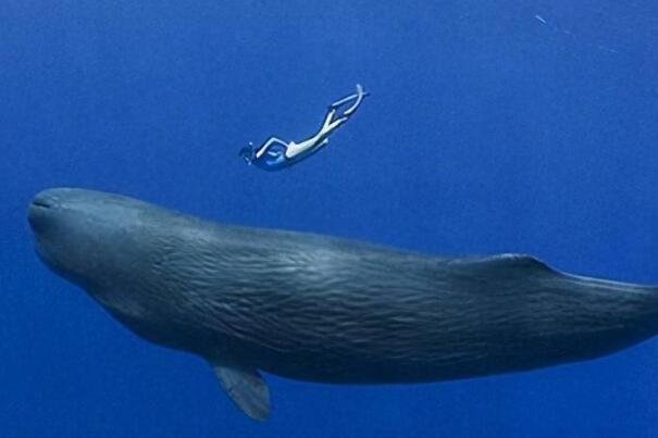 抹香鲸的头部巨大,下颌比较小,主要是以乌贼为食。体长可达18米,体重超过50吨,是体型最大的齿鲸,潜水能力极强,是世界最能潜水的十大动物排名之一。