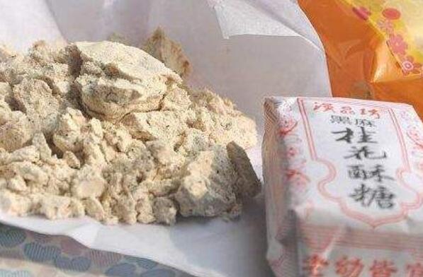 桂花酥糖是江苏徐州和安徽合肥等地的传统名点,是以面粉、蜂蜜、桂花、白糖等主要原料制作的,口感香甜酥松,既可以直接食用,也可以用沸水冲食,十分香甜可口。