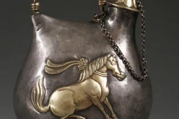鎏金舞马衔杯银壶,盛唐著名银器,出土在陕西西安南郊何家村唐代窑藏通高18.5厘米。这件仿皮囊形银壶整体造型仿照骑马的游牧民族储水用的皮囊,上口敛而底部呈扁弧形,周身看不到焊缝。器腹两面均锤出一马衔杯纹,马颈系飘带,昂首扬尾,似作舞状。纹饰鎏金。形制优美,图案别致,制作精工。圈足内有墨书一行:“十三两半”,标示了该壶的重量。
