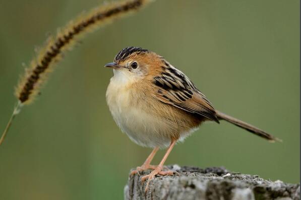 作为世界上最小的鸟类之一,金头扇尾莺的体长只有9-11厘米,它们有着娇小的体型和较长的尾巴,身体的羽毛呈褐色,腹部的羽毛呈灰白色,喜欢栖息在高草地、芦苇和稻田等地。