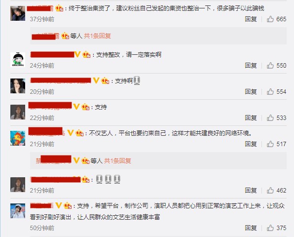 “终于整治集资了,建议粉丝自己发起的集资也整治一下,很多骗子以此骗钱” “支持啊”。