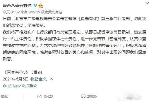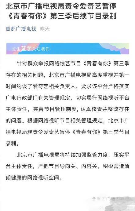 《青你3》也被要求暂停录制。