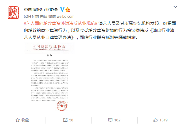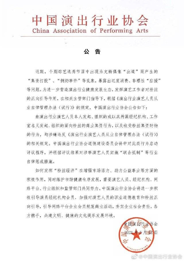 公告称近期个别选秀节目为支持偶像出道出现了“集资打投”“倒奶事件”等多个乱象,暴露了饭圈过度消费、非理性追星等问题,为了演出行业健康发展生态,中国演出行业协会在相关主管部门指导下,根据《演出行业演艺人员从业自律管理办法(试行)》的规定,公告如下:由演出行业演艺人员本人发起、组织的或以其所属经纪机构、工作室名义发起、组织的面向粉丝的商业集资行为,以及收受粉丝集资财物的行为,均涉嫌违反《演出行业演艺人员从业自律管理办法(试行)》的相关规定。中国演出行业协会道德建设委员会将针对此类行为启动评议程序,并根据评议结果对涉事演艺人员实施“联合抵制”等行业自律惩戒措施。