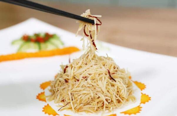 发丝牛百叶是由长沙市清真菜馆李合盛创制于19世纪20年代的湖南传统名菜,是与红烧牛蹄筋、烩牛脑髓并称牛中三杰,利用切丝的牛百叶为菜品主料的名菜,这道吸入法系的牛百叶成品质地脆嫩,并可品尝到咸鲜酸辣等多种口味。