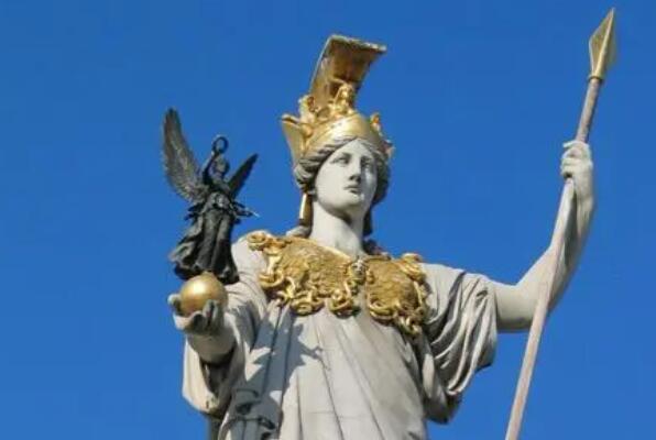雅典娜女神像是通高12米,利用木料为主,并以黄金装饰衣饰、象牙做皮肤表面装饰的巨型全身立像,光希腊式长衫就用去了2545磅黄金,在雅典娜的战盔上海立有三个小雕像,分别是居中的斯芬克斯像和左右两侧的格里芬斯像。