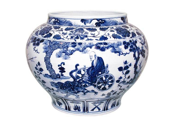 这是元代青花瓷器,整体看起来颈短身宽,瓶身印有鬼谷子下山的故事,生动逼真。在2005年,以1400万英镑拍出约人民币2.3亿,创下了当时中国艺术品最高拍卖记录。