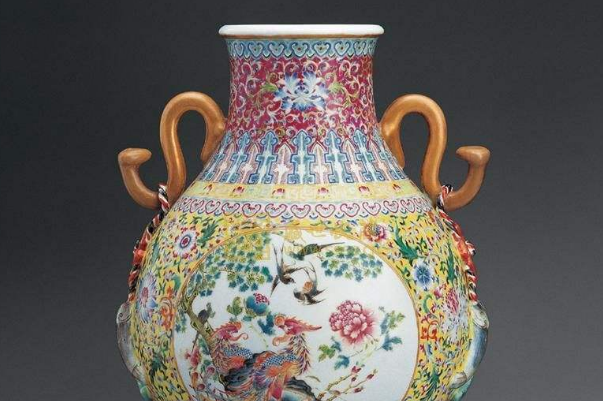 这是俗称古月轩的瓷器,是乾隆时期的代表作品,外形小巧秀丽,两侧有“双耳”,布局均匀,色彩鲜丽,在拍卖会上以1.15亿港元卖出。