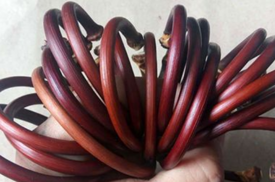 当鸡血藤开口变大时,可用小型的电吹风对着开口加热几分钟,再根据自己的需求定型,在表面上均匀涂抹一层无色的橄榄油后,将其密封在袋子里放几天,但不宜直接放在明火中烘烤,以免出现烤糊的现象。