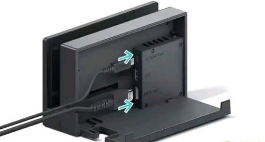 2.将充电器连接到上部插孔,并将HDMI电缆连接到下部插孔。然后关闭任天堂Switch船坞盖。