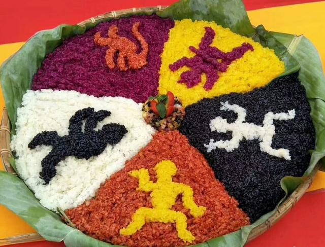 五色糯米饭是广西壮族地区的特色美食。五色糯米饭有红黑黄紫白五种颜色,色香味俱全,龙州人十分喜爱,蒸熟的五色糯米饭色泽艳丽,一口咬下去散发出的那种淡淡的植物香味会让人回味无穷,五彩色素都是天然植物提取,非常健康!光看颜色就很喜欢。