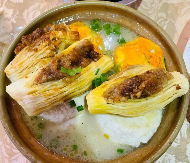 竹笋酿是广西贺州市的一种特色美食,要把摘来的竹笋过一道水,然后用尖锐的东西把一整个竹笋划成细细的丝,再过一道水,等冷却好就可以把准备好的馅料包裹进竹笋丝里面,慢火煎黄后,加汤慢慢闷熟,爽口细腻,鲜香可口,让食客赞不绝口,来到广西贺州旅游的亲值得一试哦!