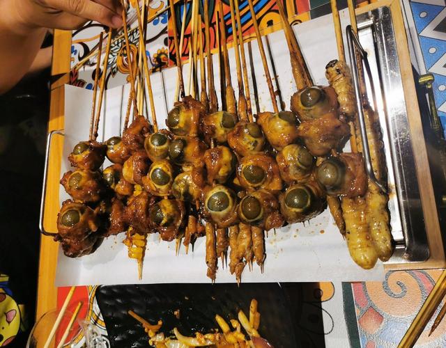 在广西的百色市,有一道堪称暗黑料理的百色特色美食猪眼睛烧烤,当地人觉得美味至极,但外地人说吃不下,甚至不敢看它一眼。吃的时候要把烤猪眼整个放到口里闭上嘴轻轻一咬,砰的一声,爆浆了!嚼起来有点像咬着有韧性的猪皮或蹄筋,更鲜香,更脆滑,没有想象中那么恐怖,越嚼越香,相当美味!