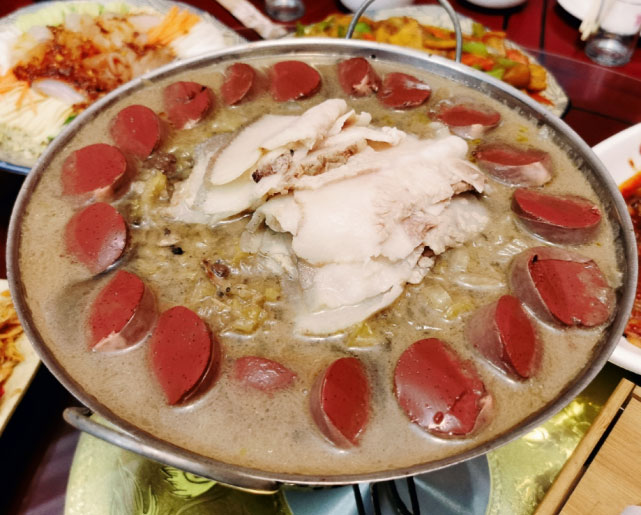 白肉血肠是东北的名菜,也是吉林省的特色名菜,做法简单,它的制作方法就是把白肉、猪血肠、猪肝、猪大肠、酸菜等一起旺火炖煮烩好,白肉融合了酸菜的酸美,酸菜又解了肉的油腻,再配上血肠的滑嫩,鲜咸可口,喷香味浓,也可以先炒酸菜加水煮开,再下薄薄的白肉片和血肠,火锅一样的吃法,简直不要太美味哦!