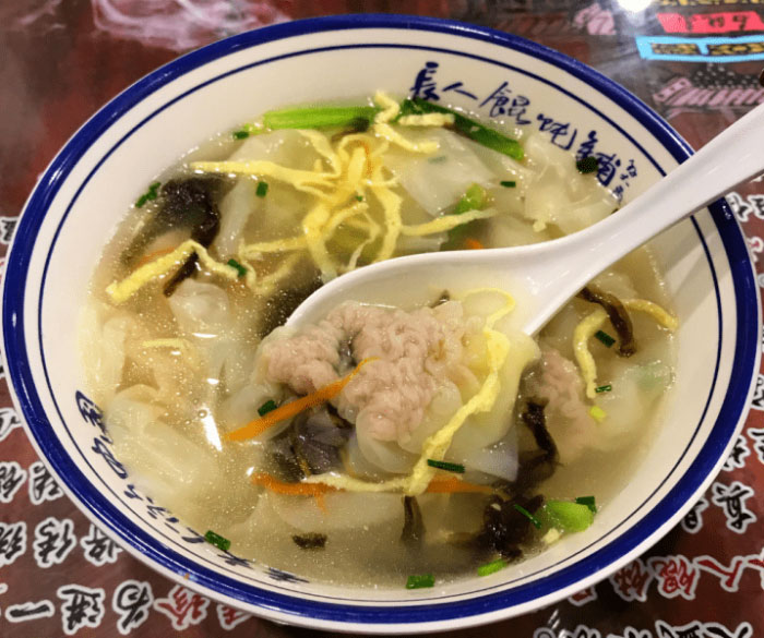 长人馄饨是浙江省温州市的一道特色小吃,馄饨个头蛮大的,皮很薄,肉是连成整片包在里面,咬一口肉馅儿清晰可见,很鲜美,鲜肉馄饨除了榨菜肉丝薄皮馄饨,还有几个虾仁,味道还是不错的。汤底大有乾坤,有虾干,菠菜,蛋皮萝卜丝,所以整体汤底特别鲜。