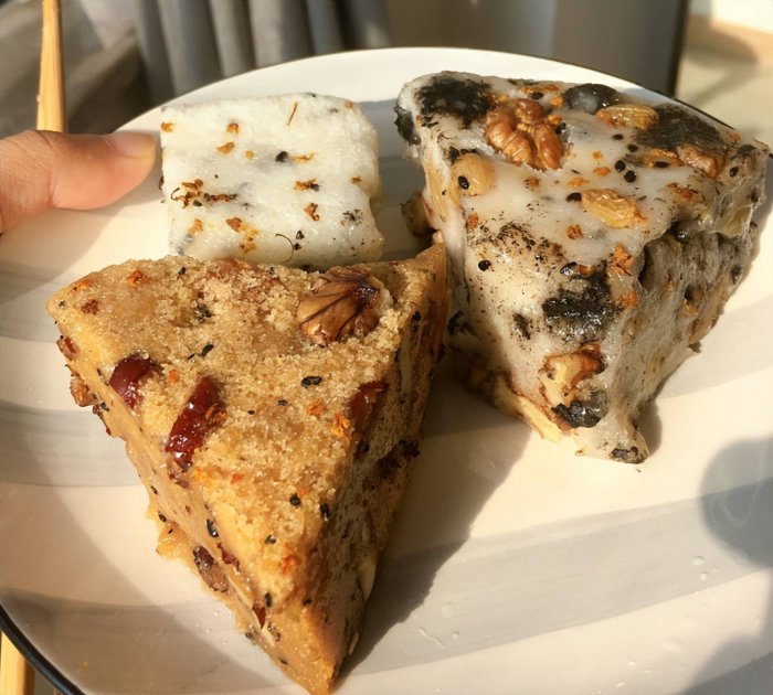 温州的松糕可以说是又松又软,因发明者谷进芳身材不高故取名矮人松糕。师傅们使用专门的模具,现场制作不同口味、大小的松糕,小编我喜欢吃红枣核桃松糕,刚出锅是软软的倍儿香,口感是硬硬的特别有韧性,咬下去更有质感和颗粒感,甜度也比较低,红枣的味道很突出,而且里面的芝麻很多,越嚼越好吃,放凉以后又是另外一个口感,都好吃!