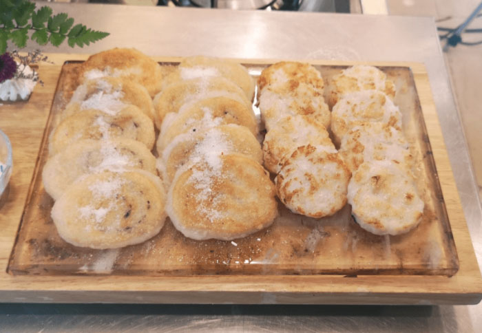 猪油糕是浙江温州等地的一种传统特色糕点,用糯米和红豆泥这简单的食材就能做出的美味,虽是用油炸的,入口却不会腻,刚出锅的时候外面又焦又脆,白糖的甜糯糯地裹着猪油的香,颗粒状猪油晶莹剔透,镶嵌其中,咬下去里面的糯米又很软糯,撒上白糖吃真的又香又甜!