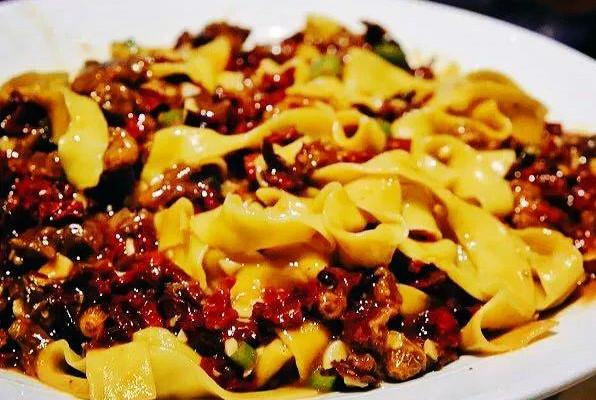 鸽捞面是新疆美食的后起之秀,在当地风靡一时,这种吃法类似于大盘鸡配皮带面的感觉,不一样的是鸽捞面中的鸽子肉是细碎的,面也是更有嚼劲的碱面。它的做法并不复杂,不过是在调味上比较有特色,鸽子肉经过腌制油炸后,配上秘制酱汁和青红辣椒丁爆炒而成。看上去色泽红辣,属于麻辣鲜香口味,吃上一口更是辣爽到爆炸,面嚼起来很有韧性。