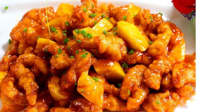 这道菜是广东当地的一道特色菜,这道菜的主要食材是用菠萝和里脊肉制作的。里脊肉切块裹上面油炸出来,然后再加入菠萝块一起翻炒,放入料汁,出锅后它独特的食材菠萝味混合着里脊肉的香味,吃起来特别的酸甜可口,大人孩子都爱吃。