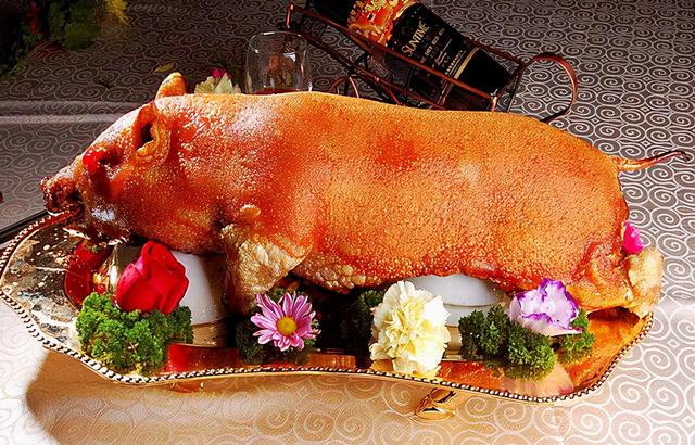 烤乳猪也是一道非常经典的菜,采用五六斤左右的小乳猪。[bai]清洗干净之后用铁棍穿起,采用手摇的方式烧烤,从而使乳猪受热均匀。烤好的乳猪色泽红亮,片成小块吃起来肉质鲜嫩,外皮酥脆,蘸点酱料,简直上等美味。