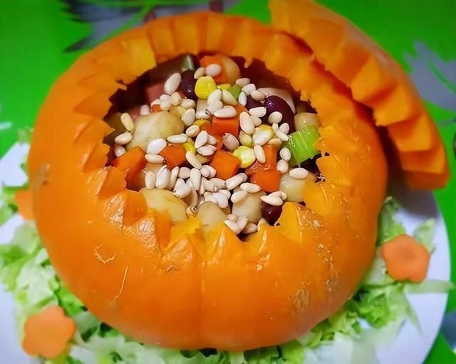 首先先要将南瓜去皮,然后开盖,把里面的东西挖掉做成碗的形状,清洗干净。再把八宝(有糯米、薏米、核桃仁等)装进南瓜做成的碗里,盖上盖子后放入锅里蒸熟之后就可以享用了,色香味俱全,又香又糯。