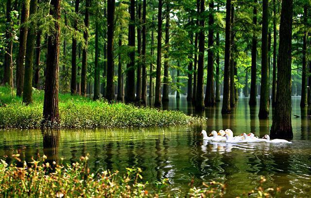 位于武汉市新洲区,这是一片大型生态湿地,一片超级治愈的水杉林,一个超美的小众旅游目的地。翠绿的池杉林错落有致,阳光撒在这片绿色的水下森林里。水中碧绿的浮萍和整齐的水杉林交相辉映,就像掉进了童话世界里的绿野仙踪。很安静,很美。