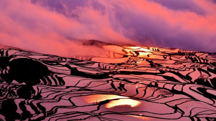 那诺梯田四季景观不同。春天,梯田轮廓清晰,色彩鲜艳。夏天,它是绿色的,充满活力。秋天,稻子成熟了,大地铺满了黄金,这是一个大丰收。冬天的梯田,云雾缭绕,变幻莫测。