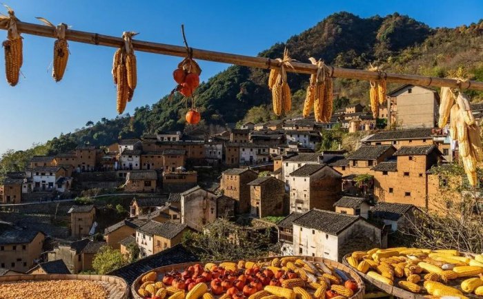 连绵起伏的山丘,乡村,流动的小桥流水,乡村的人们,远离城市的喧嚣,构成了真正的世外桃源。秋天来了,乡村晒秋,满山披秋衣。