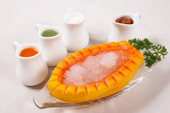 木瓜炖雪蛤是以木瓜、雪蛤和鲜奶为主要食材制成的,具有较丰富营养价值、吃起来美味可口特点的粤菜系传统名点,常吃具有润肤养颜的功效,菜品中放置的雪蛤内部含有多种人体所需的微量元素、氨基酸和维生素。