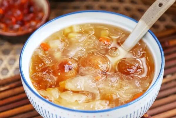 桃胶银耳羹根据糖水的名字就知道主要食材了,[bai]主要由桃胶、银耳、红枣和枸杞子为主要食材制成的家常甜品,根据各人不同口味还可加入冰糖来调和口味,吃起来不仅爽口润滑、清甜味美还具有滋补养身的功效。