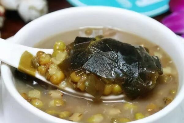 海带绿豆沙是一种广式传统糖水,以海带、绿豆、陈皮和冰糖为主要食材制成,具有清凉解热效用,在广东地区不管是高端大气的酒店还是散落在街巷间的摊铺均可以见到这种负有一定特色的特产糖水。